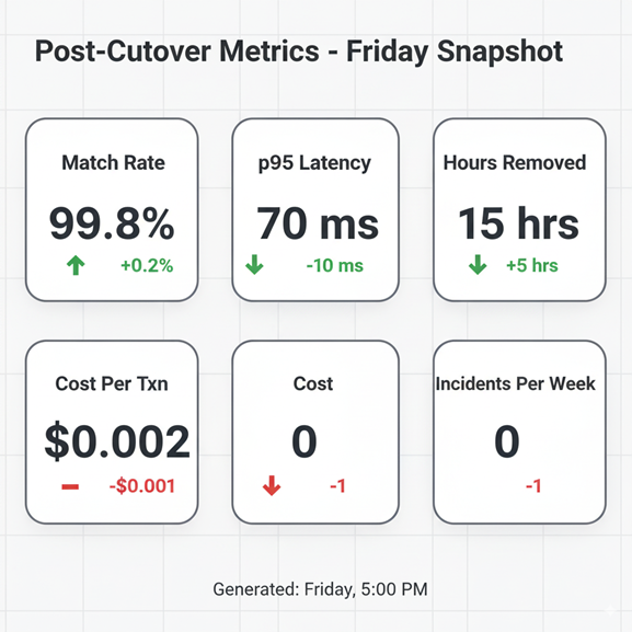 Share three numbers after cutover. Incidents on the path, cost to serve the path, and time to deploy a change. Make the story repeatable.